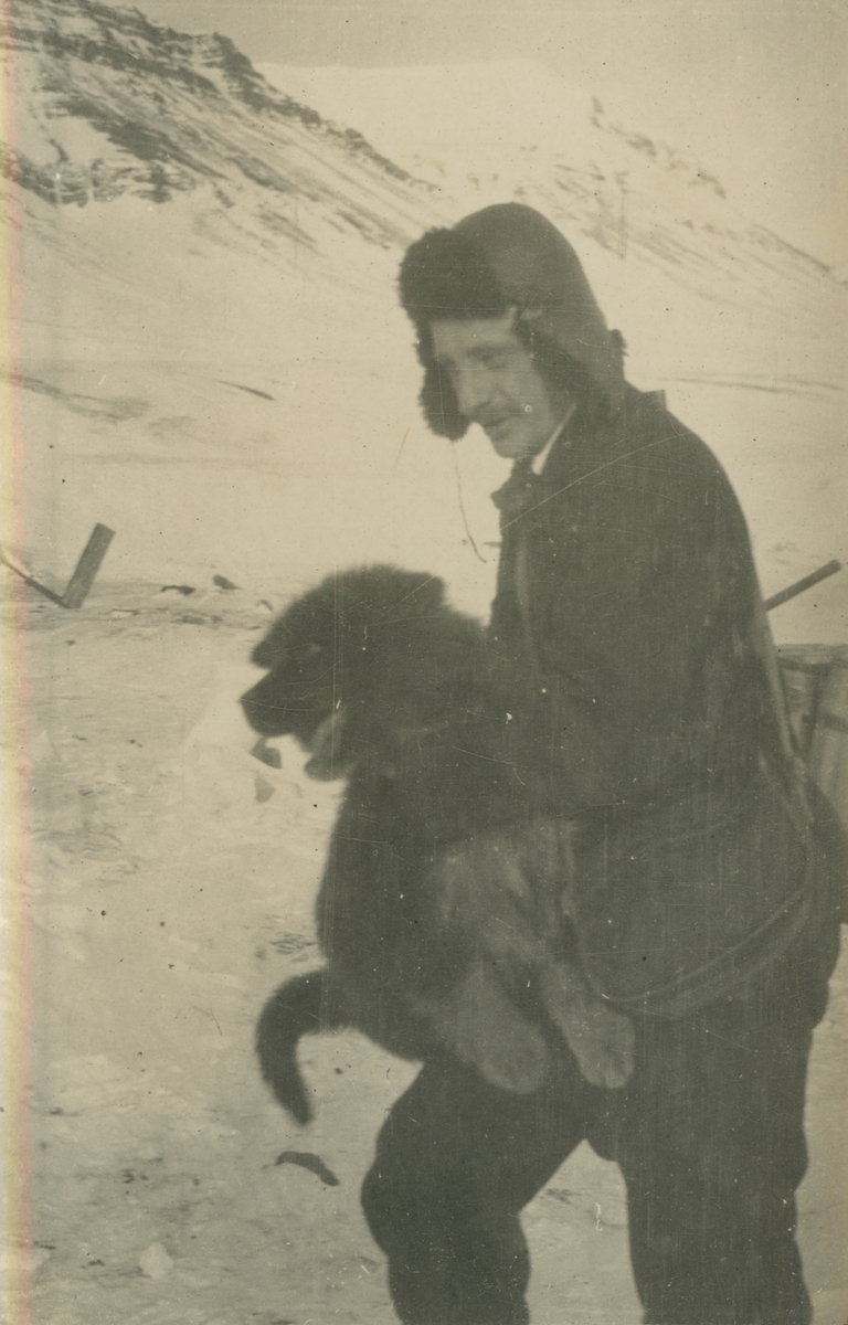 Fotografi från expedition till Spetsbergen. Motiv av mustaschprydd man i snölandskap som håller en hund i famnen.