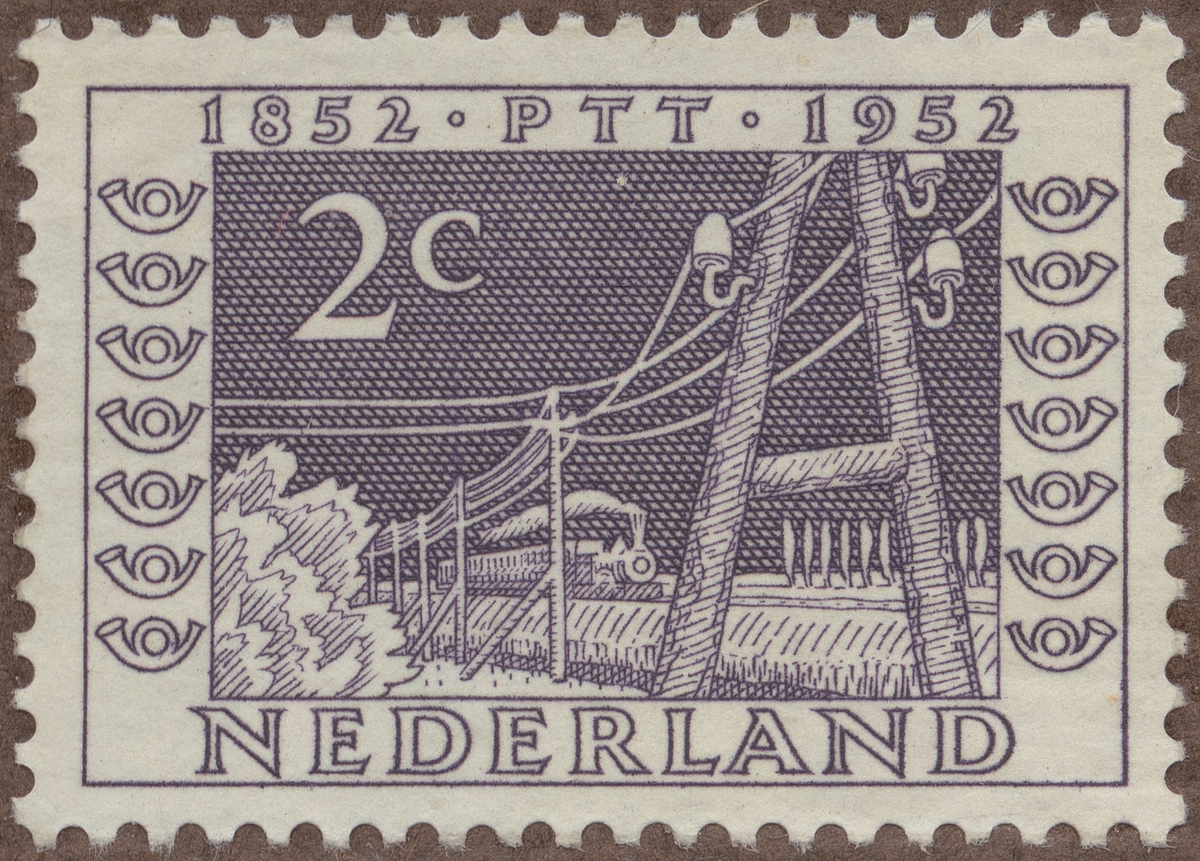 Frimärke ur Gösta Bodmans filatelistiska motivsamling, påbörjad 1950. Frimärke från Nederländerna, 1952. Motiv med Holländska telgraf- och telefonstolpar utefter järnvägslinje "Holländska telegrafen 100 år"