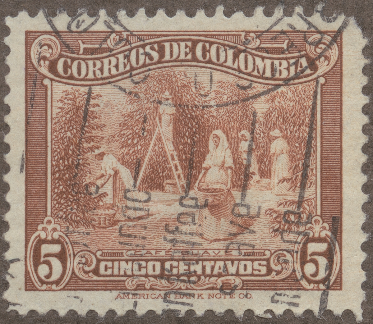 Frimärke från Colombia, 1934. Motiv av kaffeskördande.