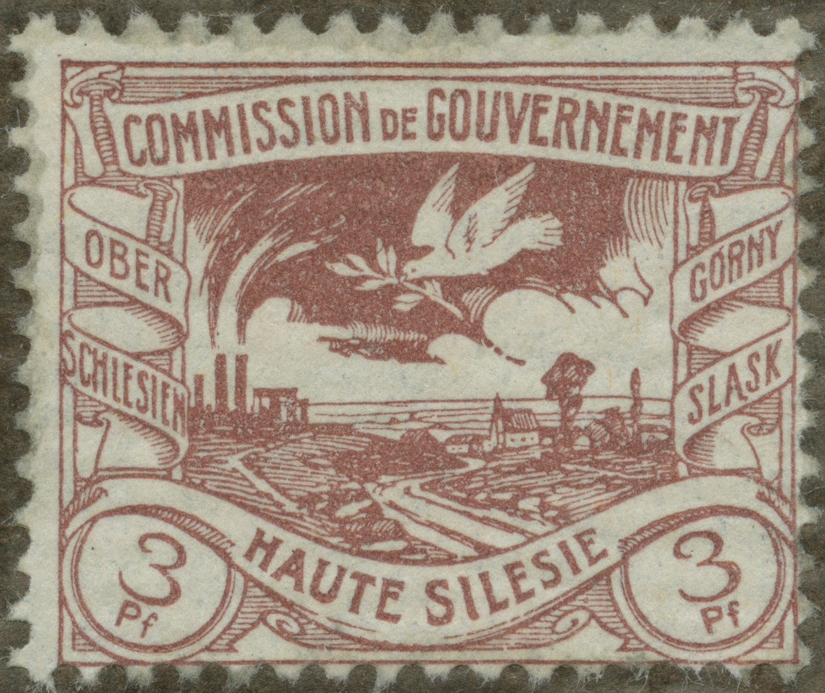 Frimärke ur Gösta Bodmans filatelistiska motivsamling, påbörjad 1950. Frimärke från Ober Schlesien, 1921. Motiv av Rykande fabriksskorstenar i landskap Ober-Schlesien.