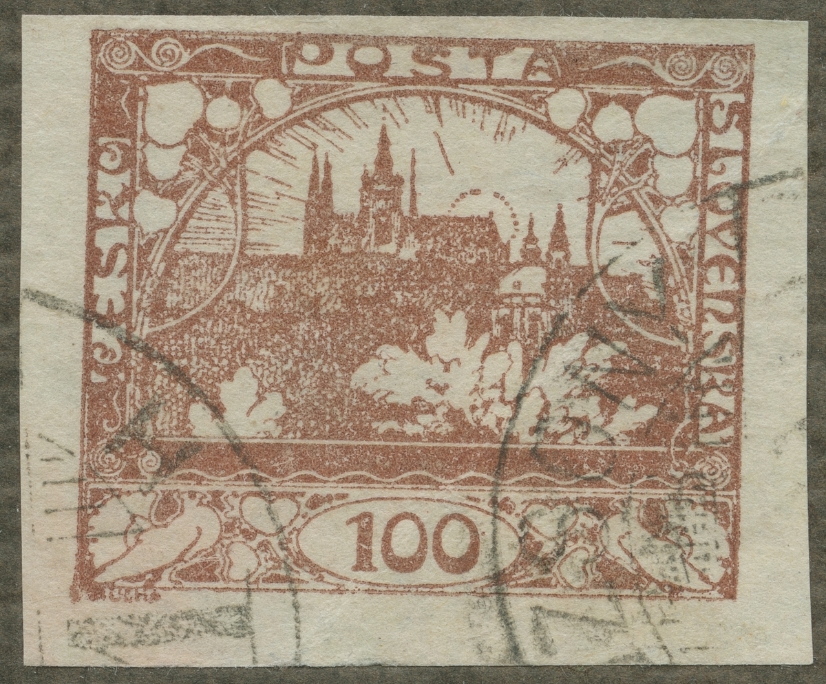 Frimärke ur Gösta Bodmans filatelistiska motivsamling, påbörjad 1950. Frimärke från Tjeckoslovakien, 1919. Motiv av Uppgående sol "bakom Slottet Hradcany i Prag"
