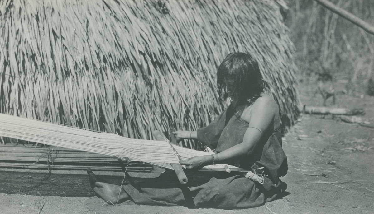 Fotografi från expedition till Peru 1920. Motiv av kvinna som sitter på marken bredvid en hydda och utför någon form av handarbete.