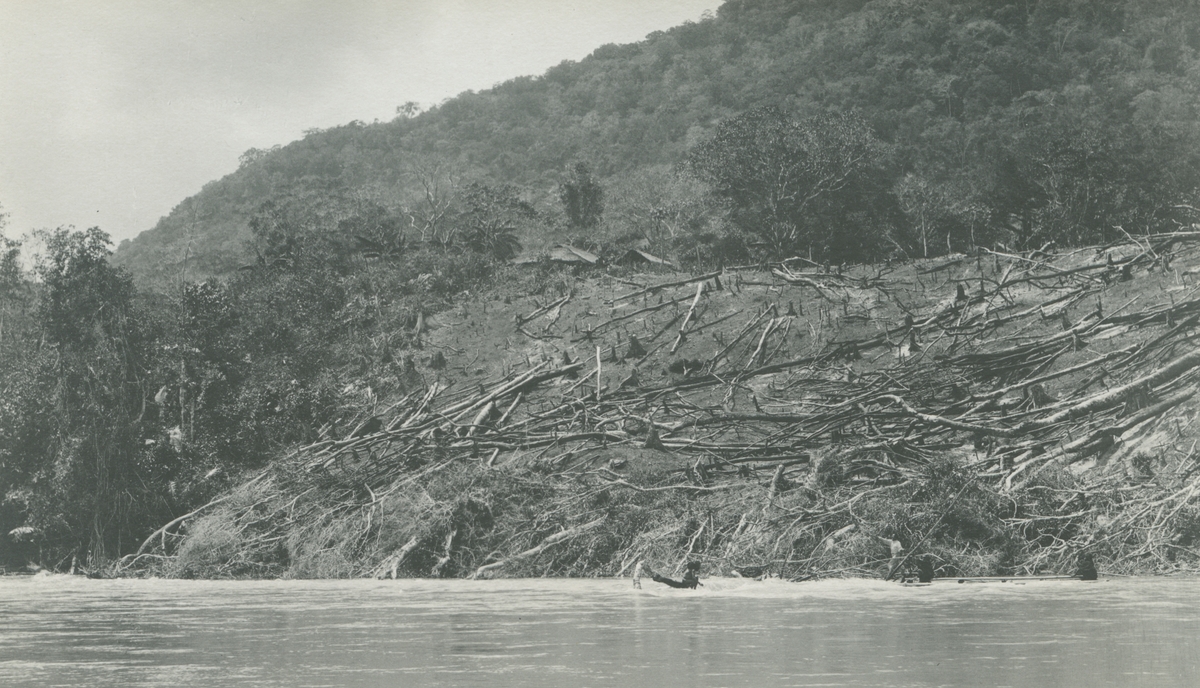 Fotografi från expedition till Peru 1920. Motiv av skövlad skog vid flod i djungeln.