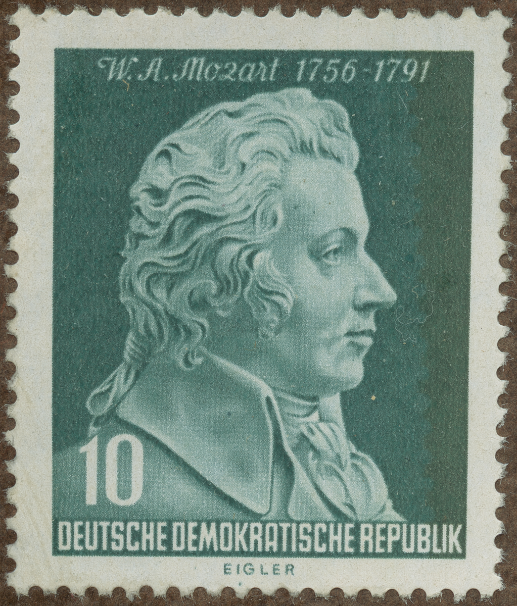 Frimärke från Östtyskland, 1956. Motiv av Wolfgang Amadeus Mozart: 1756-1791. Österr. kompositör. 200-årsminne av hans födelse: 1756-1956.