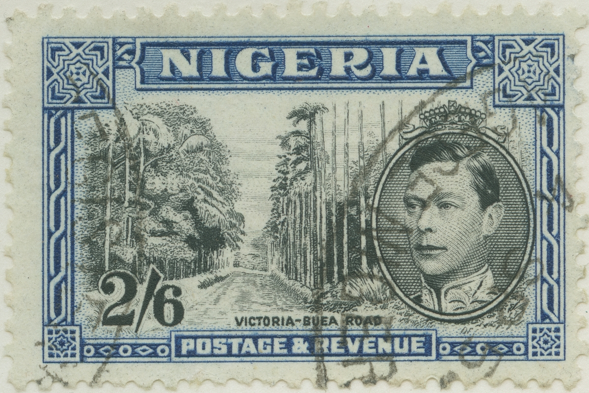 Frimärke från Nigeria, 1938. Motiv av Victoria-Buea Alléen -(t.h.): Kung George VI-