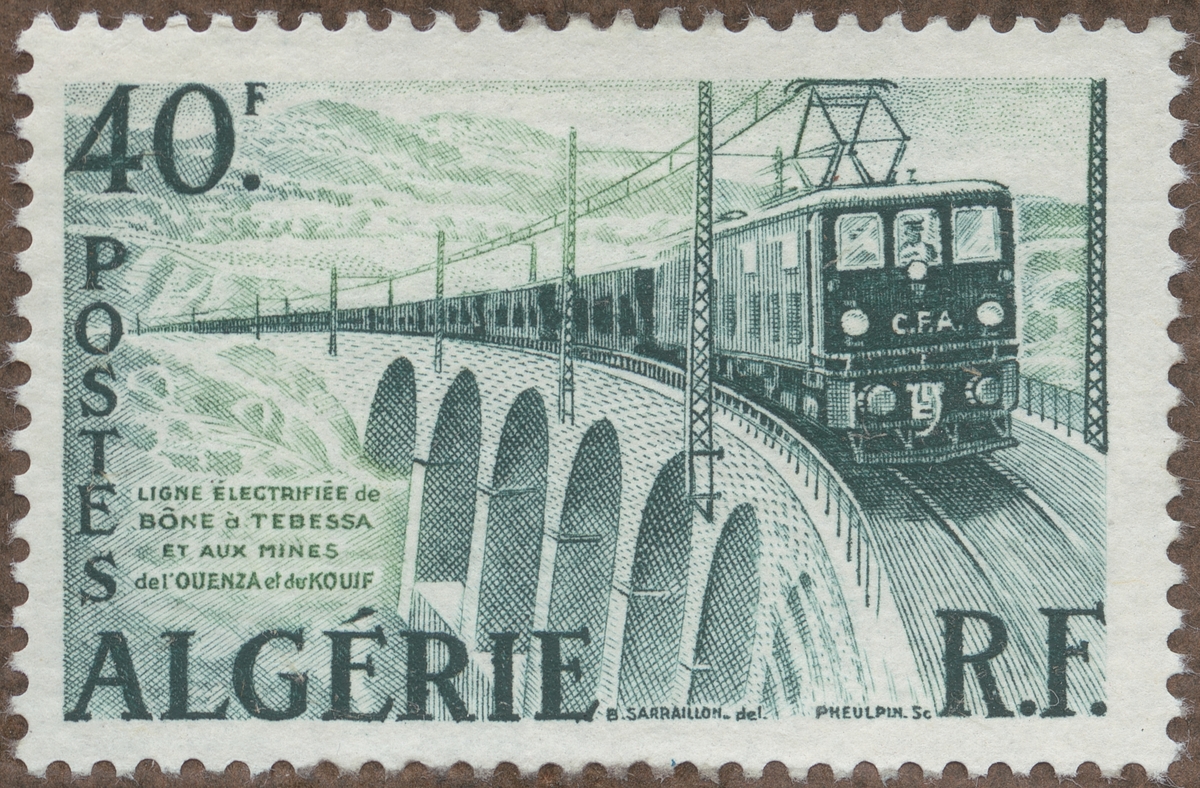 Frimärken ur Gösta Bodmans filatelistiska motivsamling, påbörjad 1950. Frimärke från Fr. Algeriet, 1956. Motiv av Elektriskt tåg "från Bône till Tebessa samt till gruvorna: Quenza och Kouif."