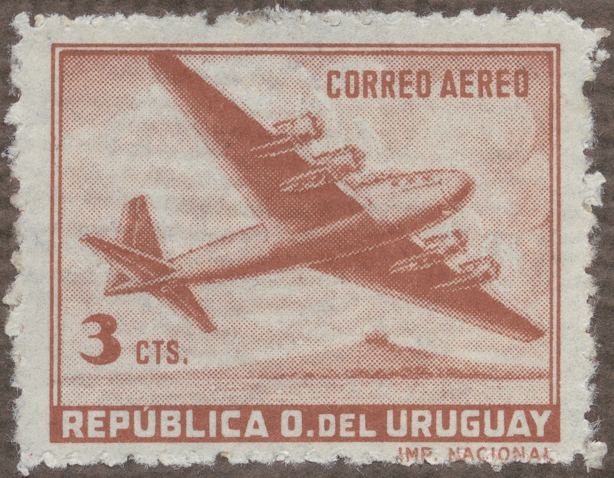 Frimärke från Uruguay, 1947. Motiv av Fyramotorigt Monoplan.