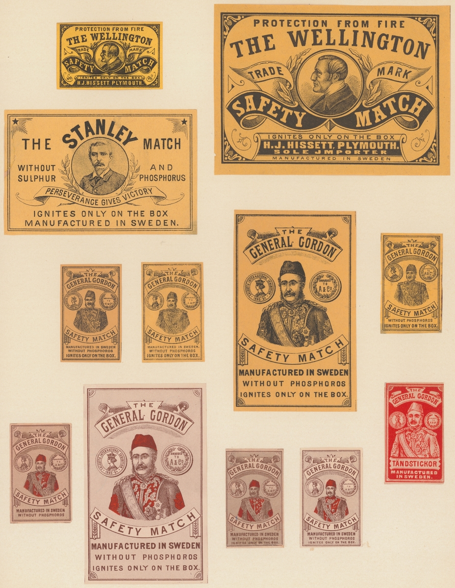 Etiketter för tändsticksaskar, från Svenskt Industri- och Handelsmuseum.