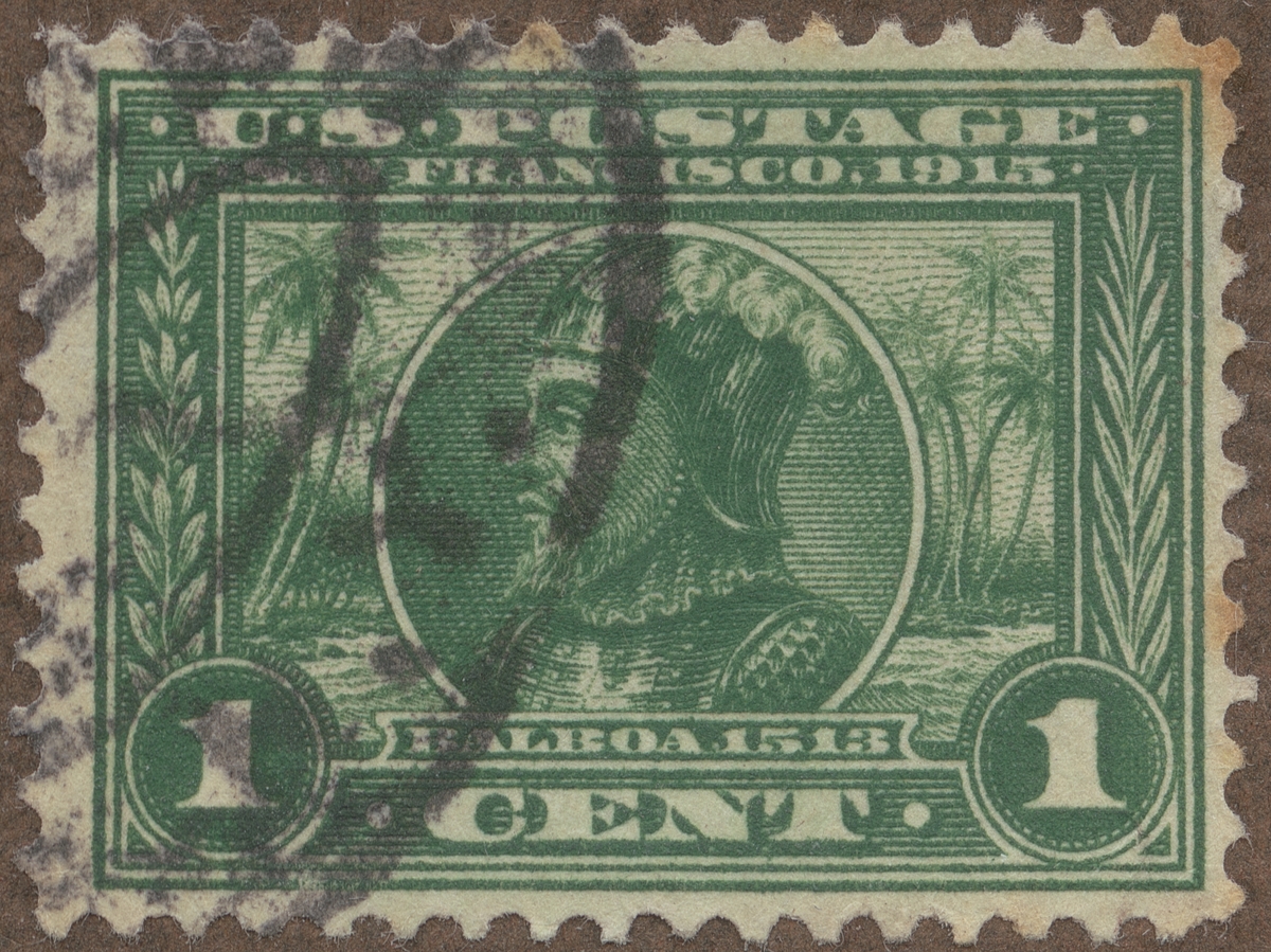 Frimärke från U.S.A., 1913. Motiv av Vasco Nunez de Balboa: 1475-1517. Spansk sjöfarare. Upptäckte Stilla Havet 1513. -Inför "öppningen av Panamakanalen" och 400-årsminne av upptäckten av Stilla Havet: 1513-1913.