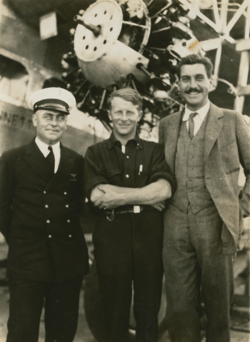 Fotografi från låda märkt Bernt Balchen. Balchen var norsk-amerikansk flygare, polarforskare och militär. Motiv av sydpolsexpedition med Bernt Balchen (i mitten) och två andra män vid flygplan.