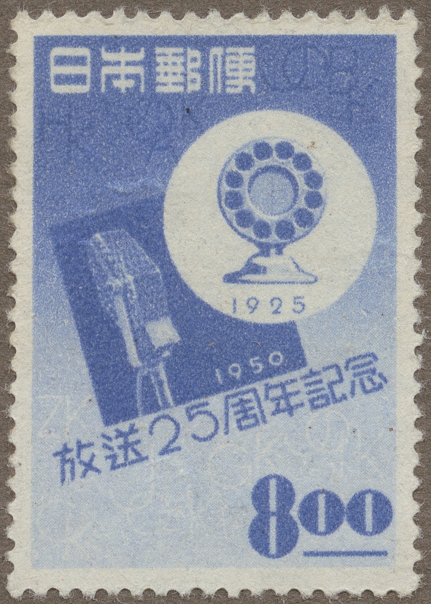 Frimärke ur Gösta Bodmans filatelistiska motivsamling, påbörjad 1950. Frimärke från Japan, 1950. Motiv av Japanska radioapparater, avsändare "Sockerbiten". Mikrofoner dels år 1925 dels år 1950. "25-årsminne av Japans radio."