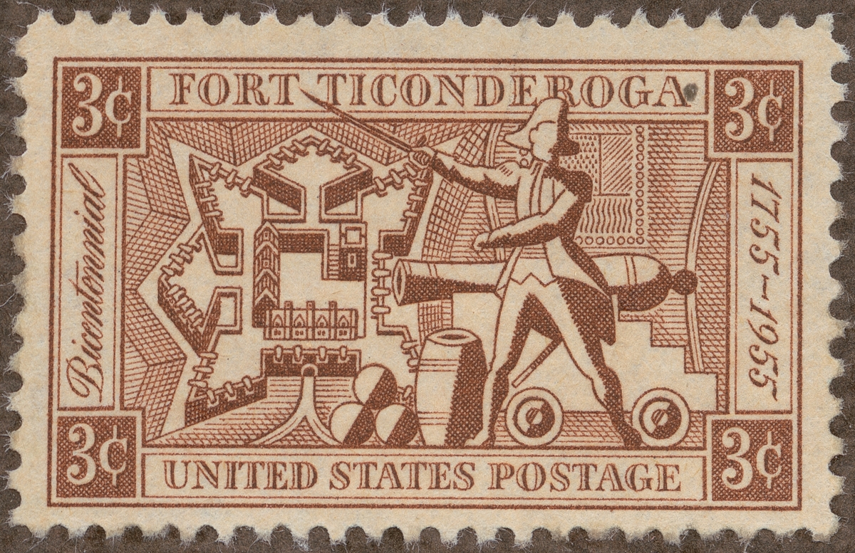 Frimärke från U.S.A., 1955. Motiv av Artilleripjäs för 200 år sedan -Plan av Fästningen Ticonderoga i New York stat- (t.h.): Ethan Allen (1738-1789) Amerikansk partisan under oavhängighetskriget. Fort Ticonderoga 200 år: 1755-1955.