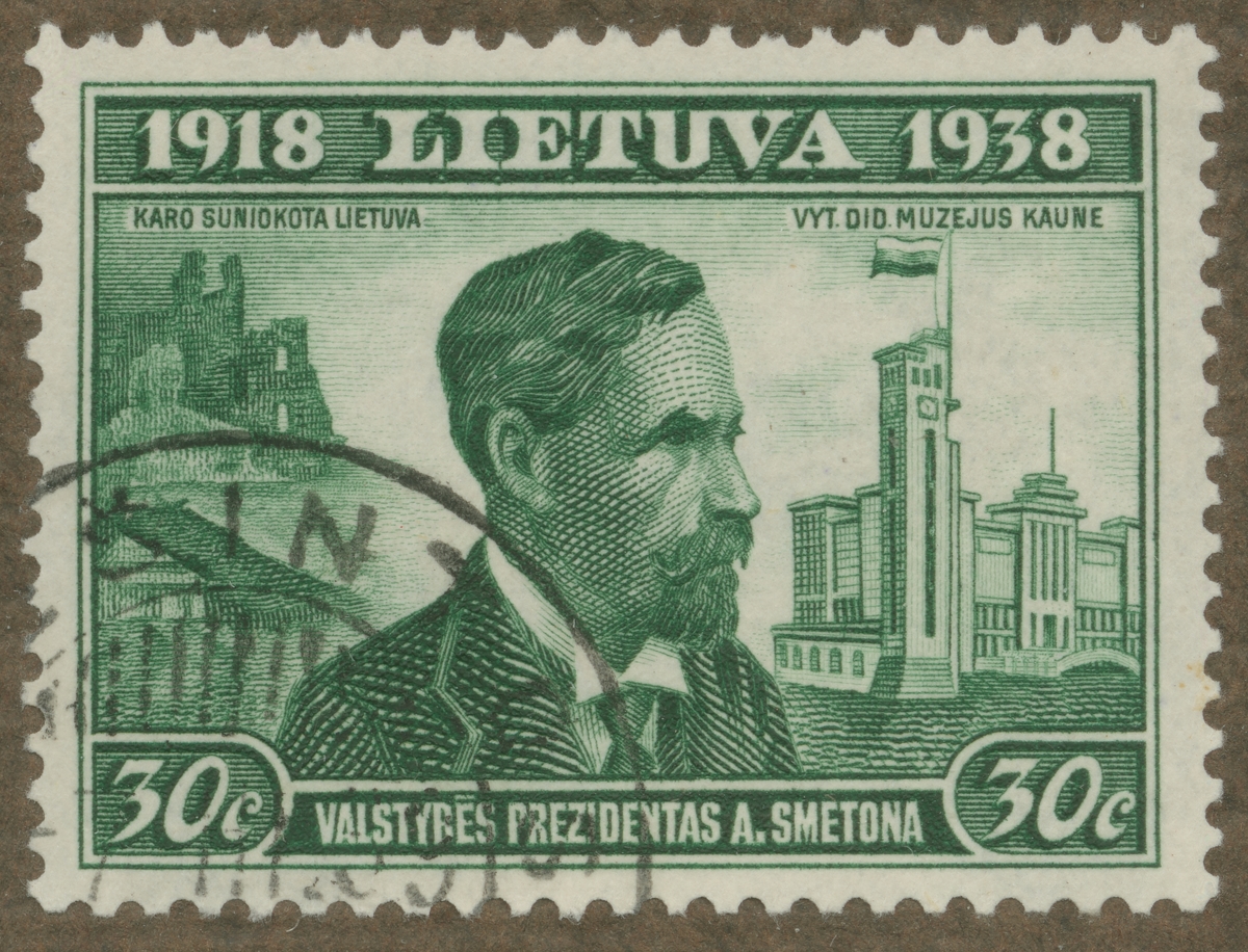Frimärke från Litauen, 1939. Motiv av President Smetona. T.h. Kaune museet. "20-årsminne av Litauens frigörelse 1918-1938".