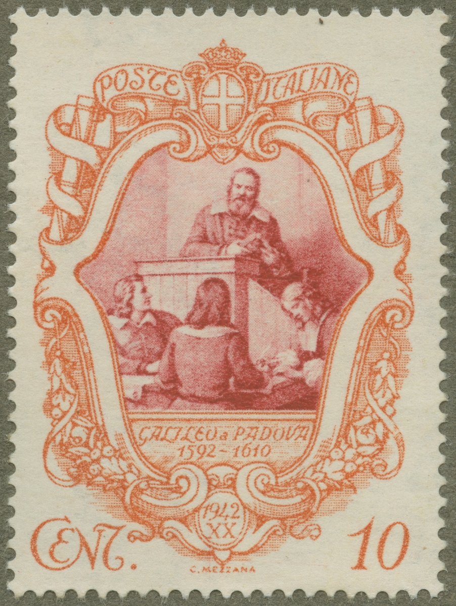 Frimärke ur Gösta Bodmans filatelistiska motivsamling, påbörjad 1950. Frimärke från Italien, 1942. Motiv av Galileo Galilei: 1584 - 1642 "Italiensk fysiker och astronom. (bild) Galilei föreläser i fysik i Padua 1592 -1610. 300-årsminne av hans död."