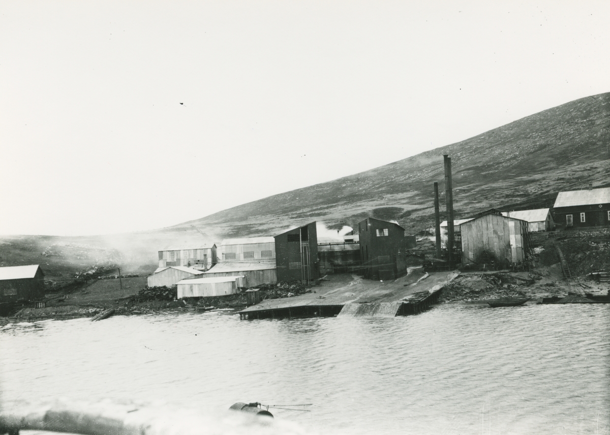 Bild från expedition i Antarktisområdet. Motiv av ett antal trähus vid vatten.