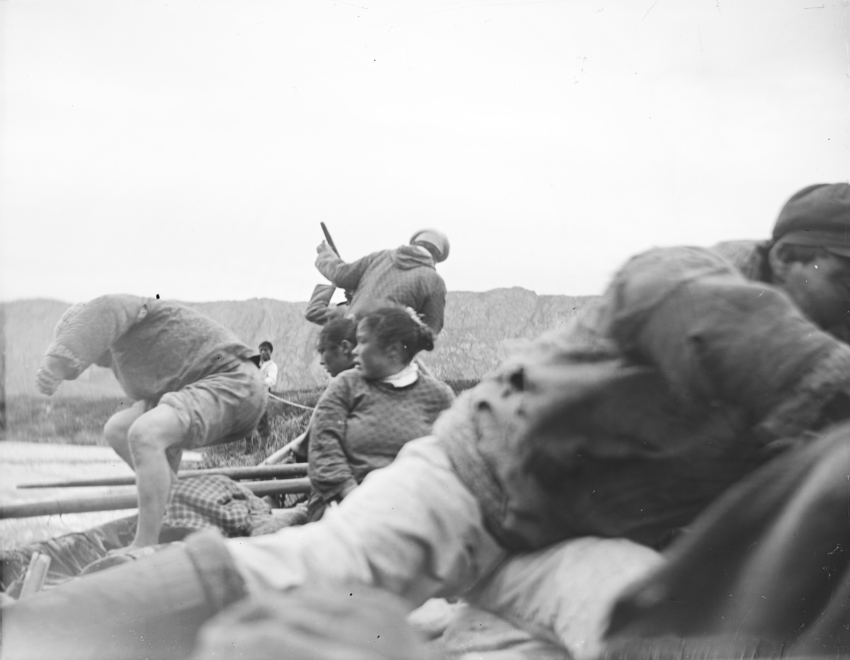 Fotografi från Grönland. Motiv av ett antal personer i en båt.