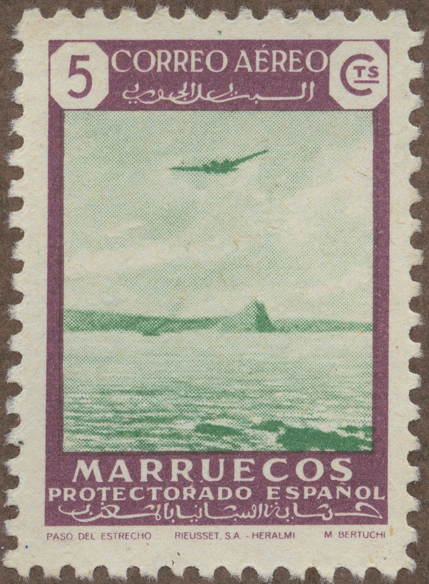 Frimärke från Spanska Marocko, 1949. Motiv av Tvåmotorigt monoplan över Gibraltar Sund.