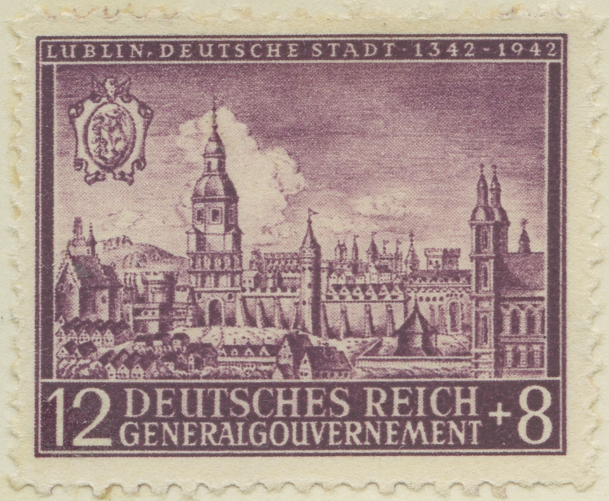 Frimärke från Polen, 1942. Motiv av Staden Lublin 600-årsminne av staden Lublins grundläggning: 1342-1942. -Tyska okkupationen av Polen: världskrig II-