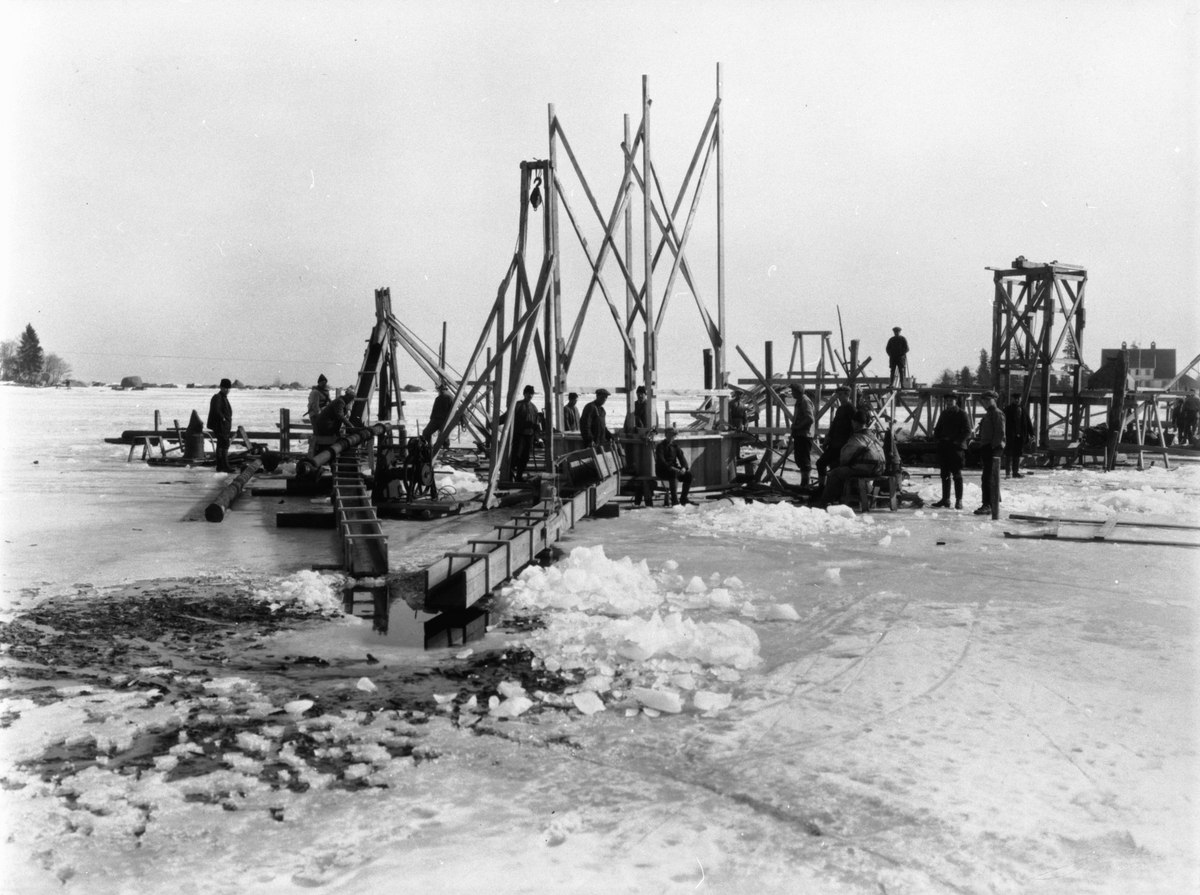 Byggherre: Byggnadsaktiebolaget Contractor, Stockholm. Den 200 m långa och 13,5 m breda pirbyggnaden i Vallvik för Marmaverken var imponerande också med avseende på det stora vattendjupet (10 m). Arbetsbyggnadplats (pir).
