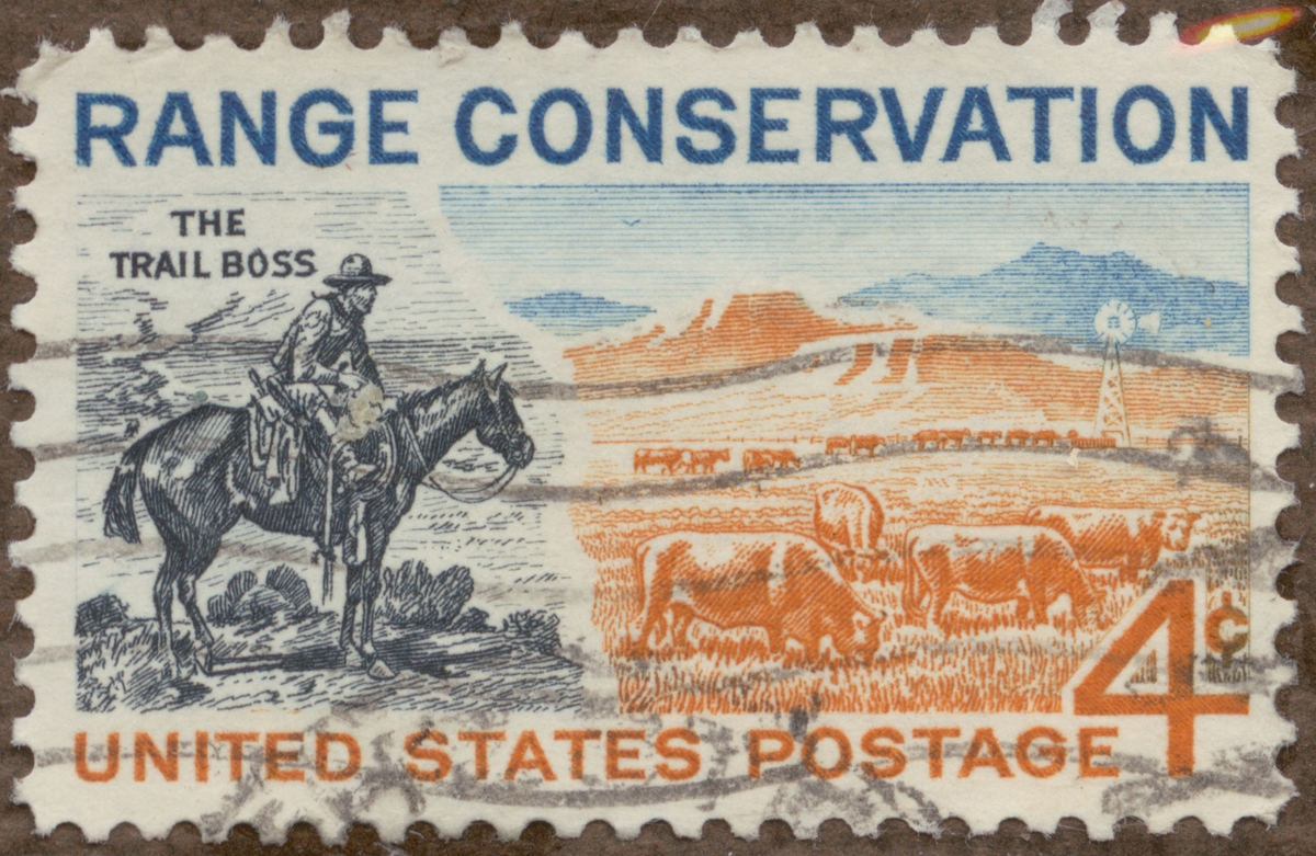 Frimärke från U.S.A., 1961. Motiv av (t.h.) Nötkreatur betande på "range land" i det västliga USA (= vidsträckt betesmark) (t.v.) The Trail Boss (= Stigfinnare basen) teckning av Charles M. Russel: (emblem för "American Society of Range Management", Washington, D.C. -Propaganda för betesmark vård (= Range Conservation) samt minne av sällskapets möte: 1961