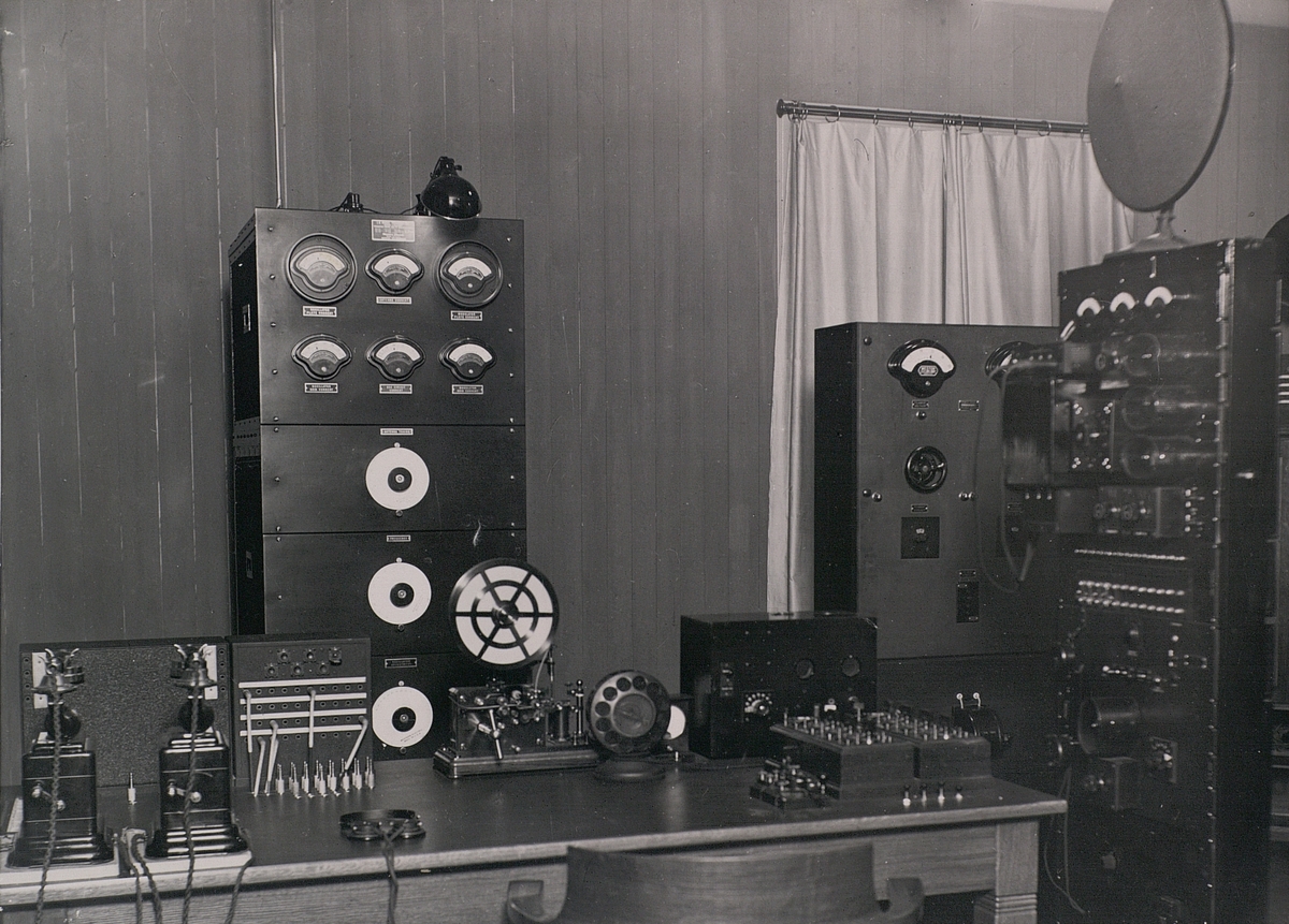 Sundsvall 1957. Interiör från stationen. 1 kW-sändaren här utbytt mot 10-kW-sändare 1928 (jämför Hörby) . Stationen av år: 1957 har 150 kW antenneffekt.