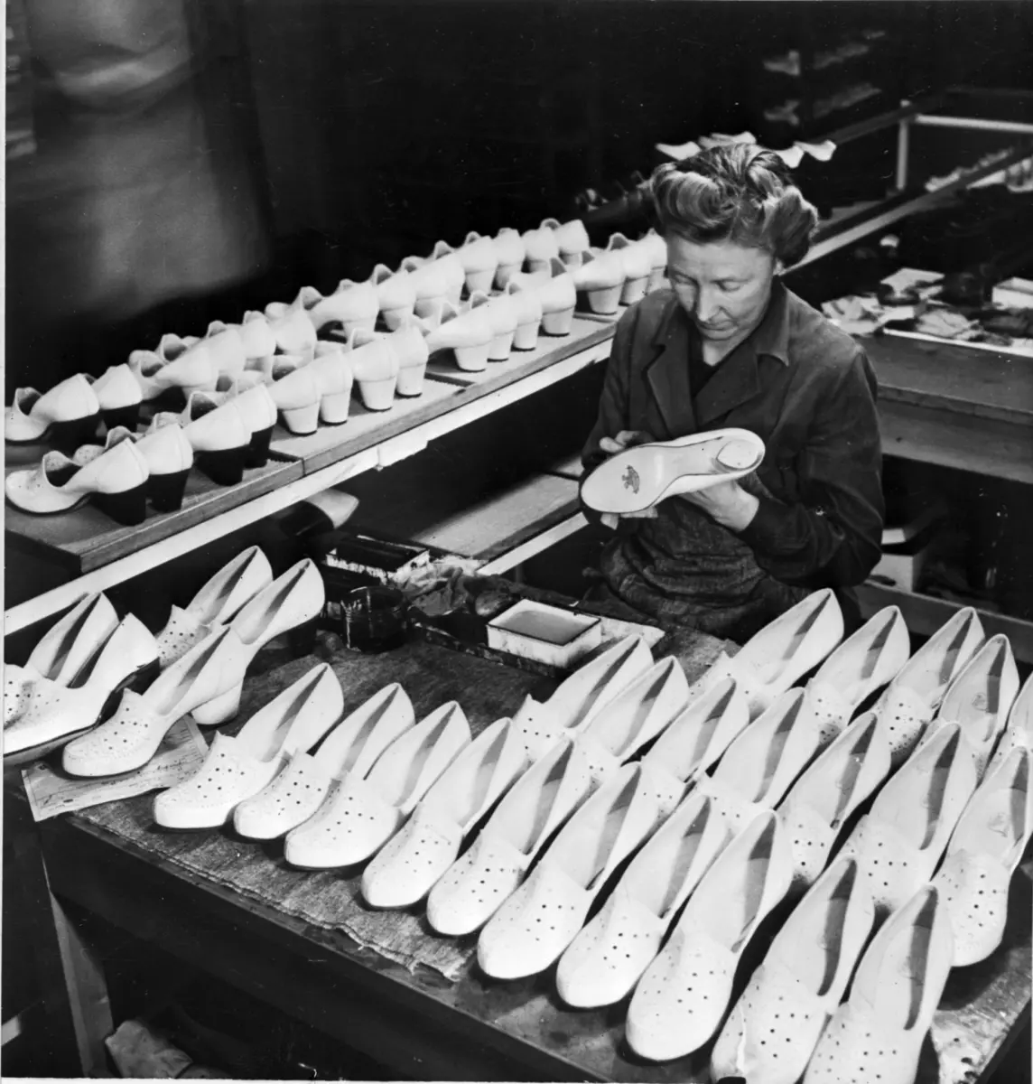 Bild från skofabrik, troligen i Örebro, möjligen Kumla. Kvinnlig fabriksarbetare synar skorna.