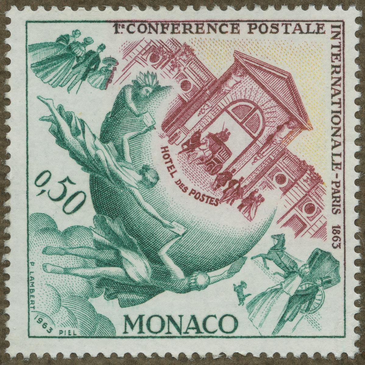 Frimärke från Monaco, 1963. Motiv av Posthus i Monaco. -Postdiligens. Folk i 1863-dräkt. Hästfordon. -Internationell Postkongress i Paris: 1863-