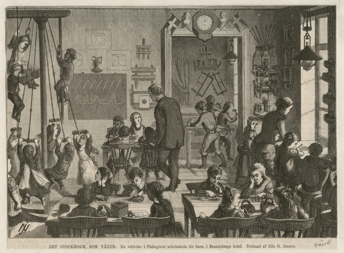 Klipp ur Ny Illustrerad tidning den 3 november 1877. "Det Stockholm som växer". En "titt-in" i Palmgrens arbetsskola för barn, i Brunkebergs hotel (hotell). Tecknad av Nils G. Janzon.
