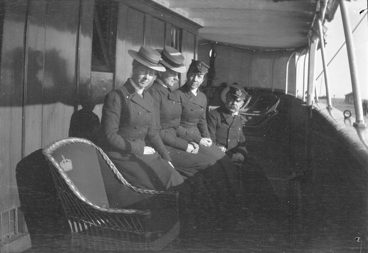 Drottning Victoria bilder. Drottningen på båt med kapten? och två flickor. HSM Drottt?