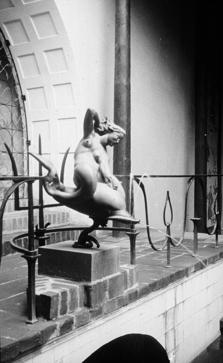 Skulptur/ fontän. Kvinna ridande på delfin.