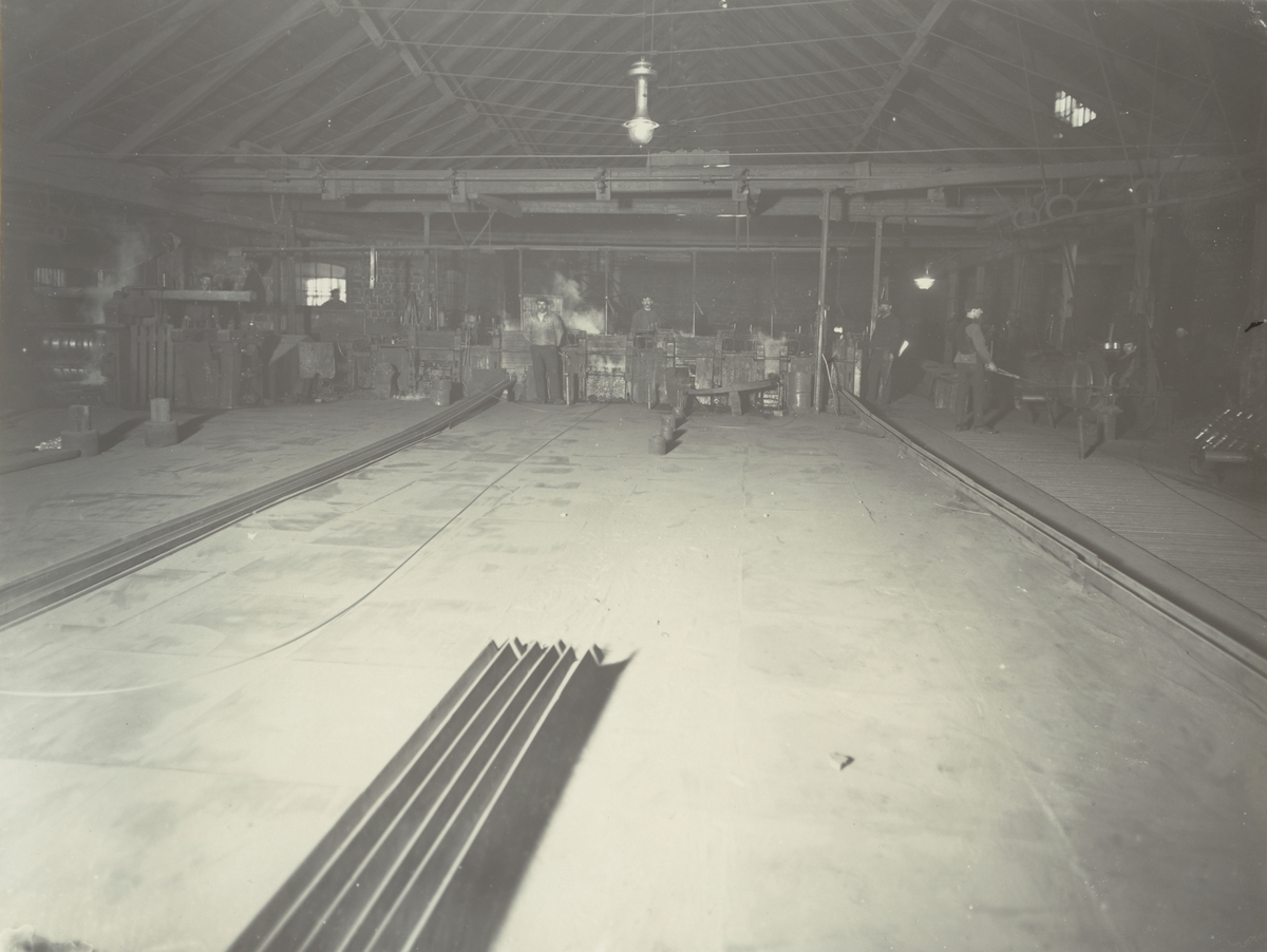 Boxholms Järnverk. Flemminge gamla finvalsverk under pågående trådvalsning omkring 1915.