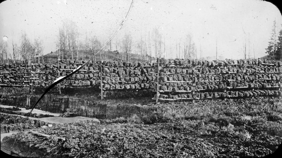 Skioptikonbild med motiv av torvtorkning på okänd mosse.