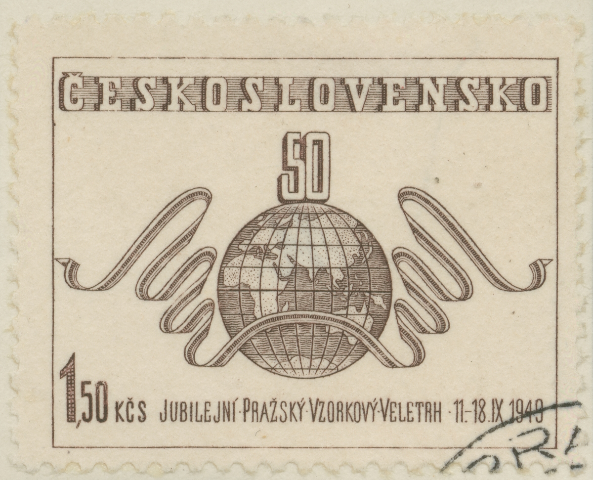 Frimärke från Tjeckoslovakien, 1949. Motiv av östra halvklotet. "Jubileum 11-18 sept. 1949 - Prag Mässen 50 år".