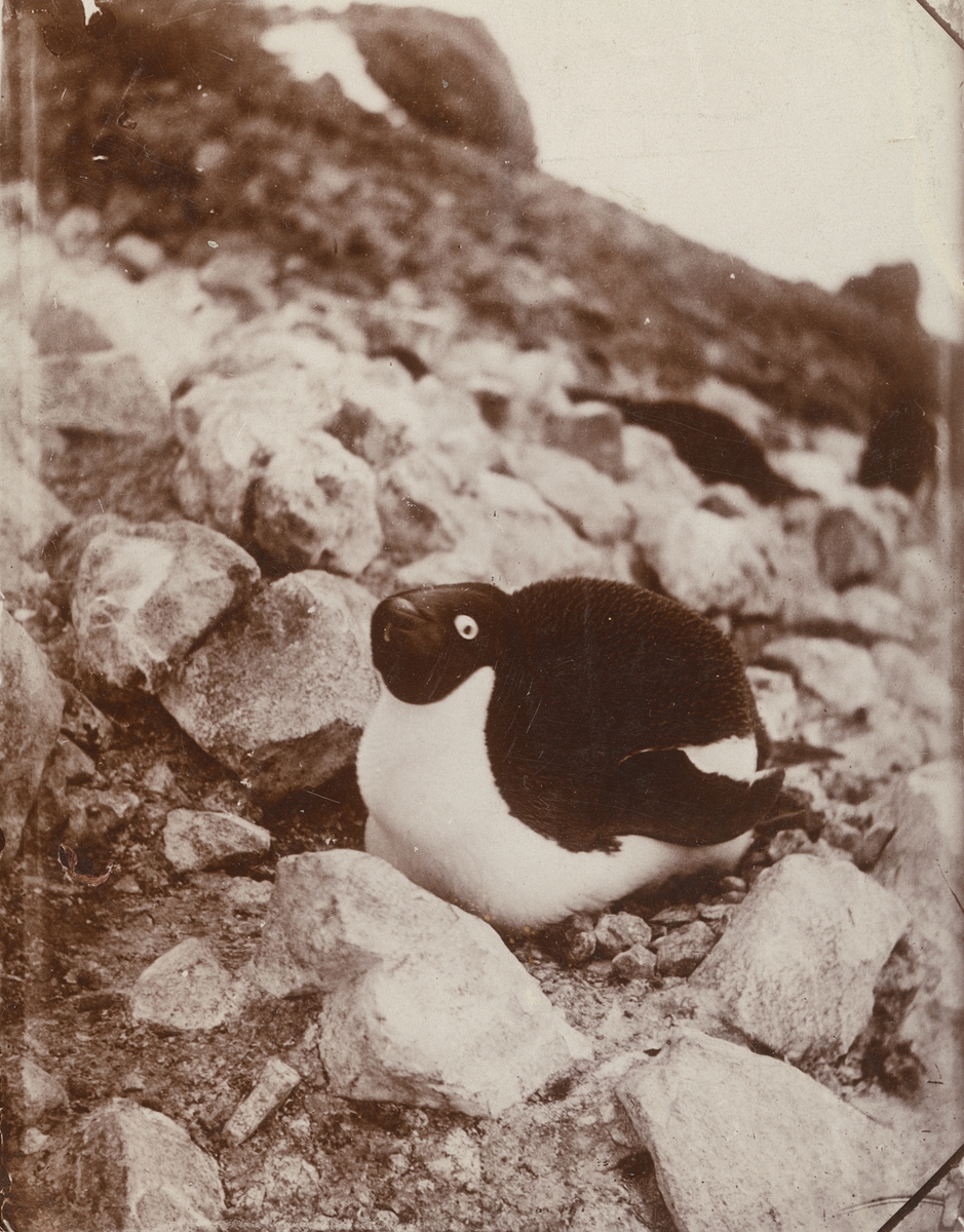 Fotografi från första svenska Antarktisexpeditionen 1901-1904. Motiv av pingivn bland stenar.