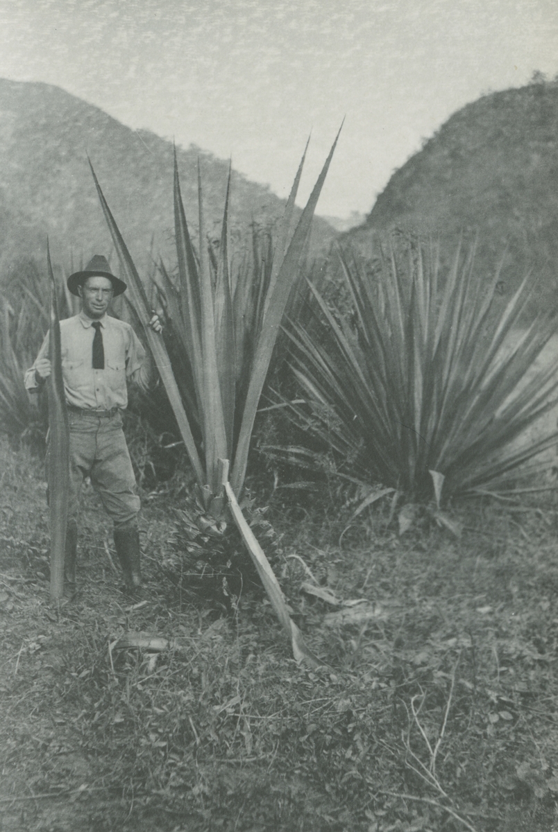 Fotografi från expedition till Peru 1920. Motiv av expeditionsdeltagare som poserar bredvid stor kaktus.