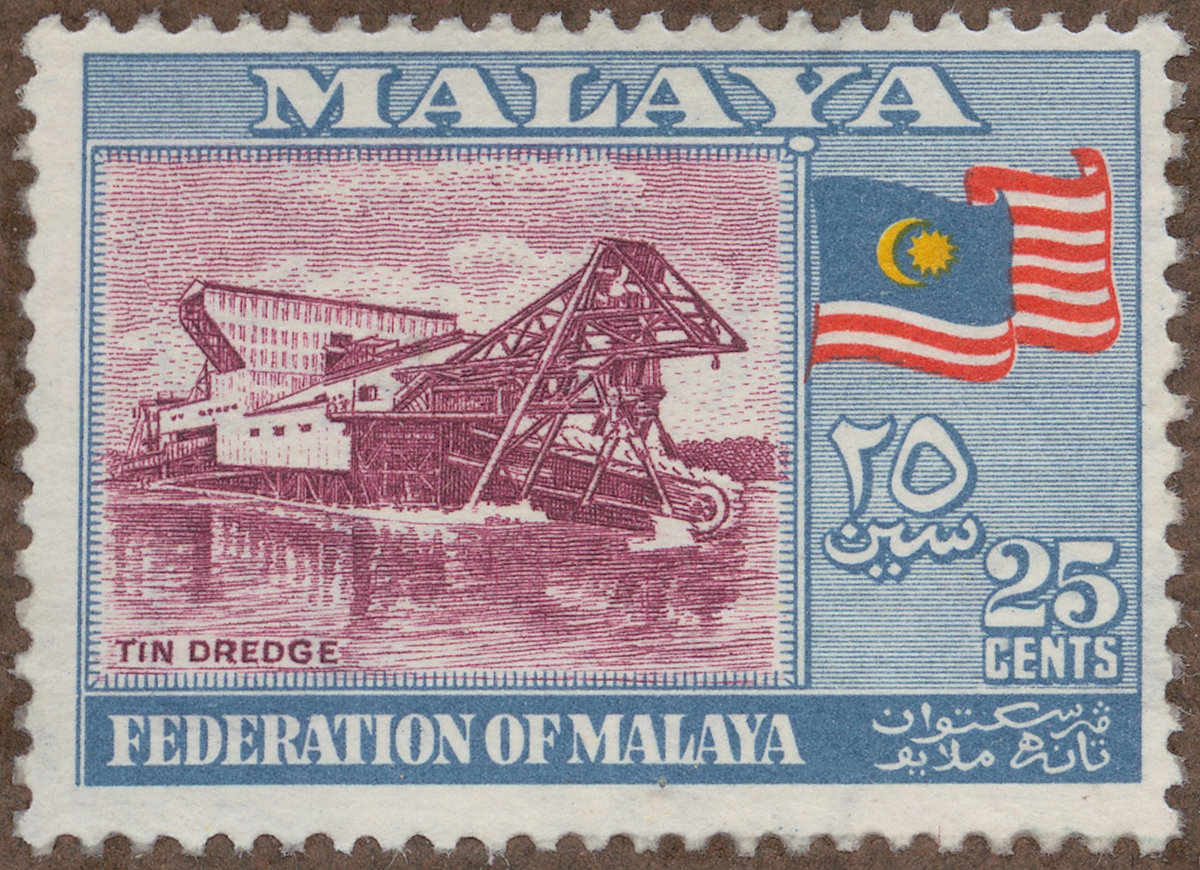 Frimärke från Malaya, 1957. Motiv av mudderverksanläggning vid Tenndriften i Malaya
