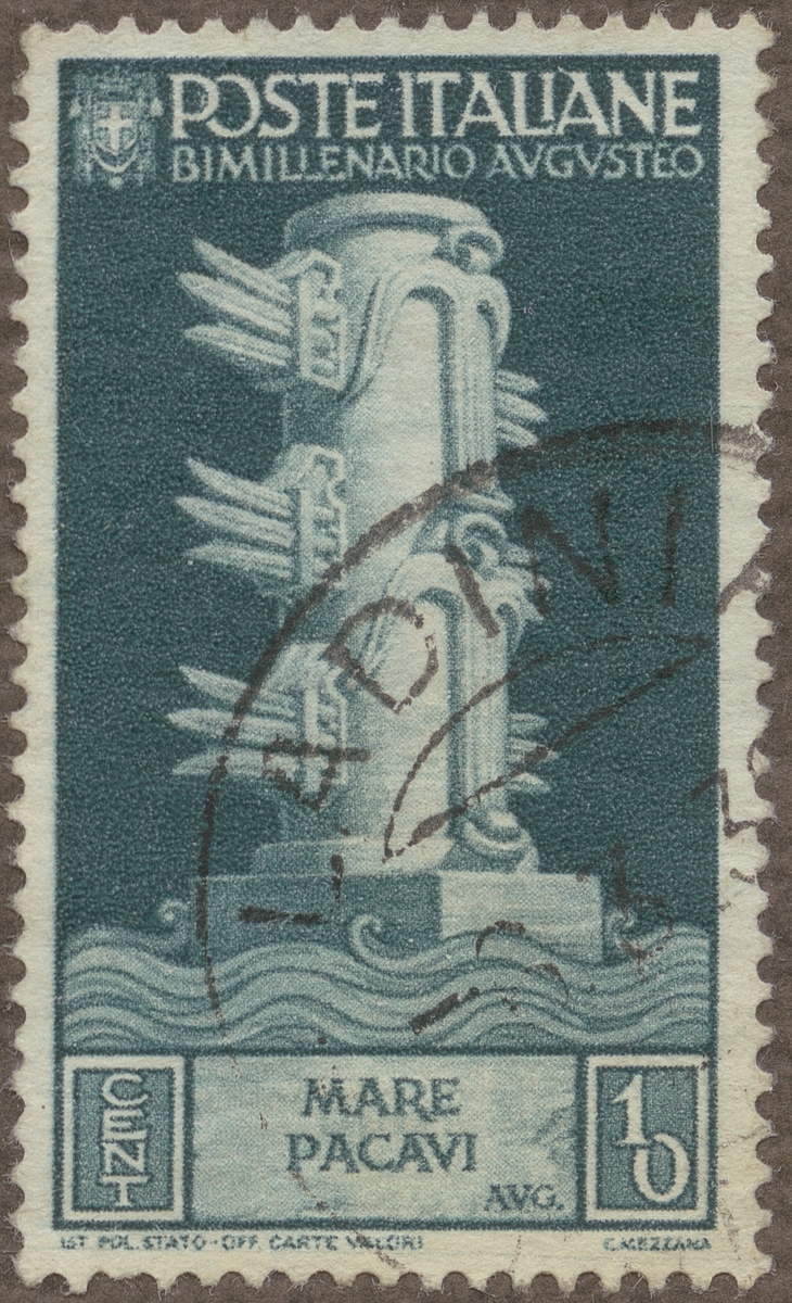 Frimärke från Italien, 1937. Motiv av Symbol för havets erövrande av romarne: "Mare pacavi". - 2000-årsminnet av Kejsar Augustus Caesar (Octavianus)- "Bimillenario Augusteo" utställningen öppnat i Rom September 22, 1937 av Mussolini.