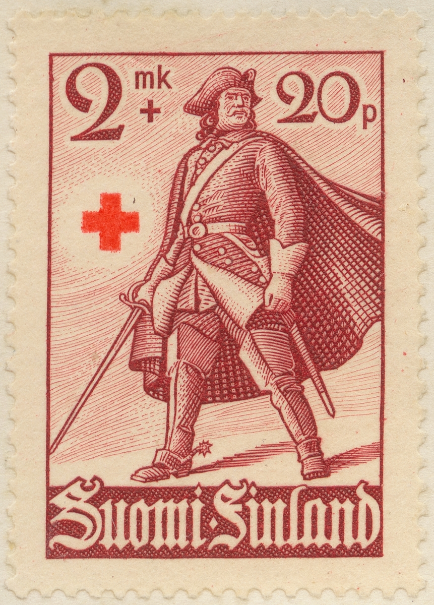 Frimärke från Finland, 1940. Motiv av Finsk officer kring år 1700 "-Serie: till förmån för Röda Korset-"