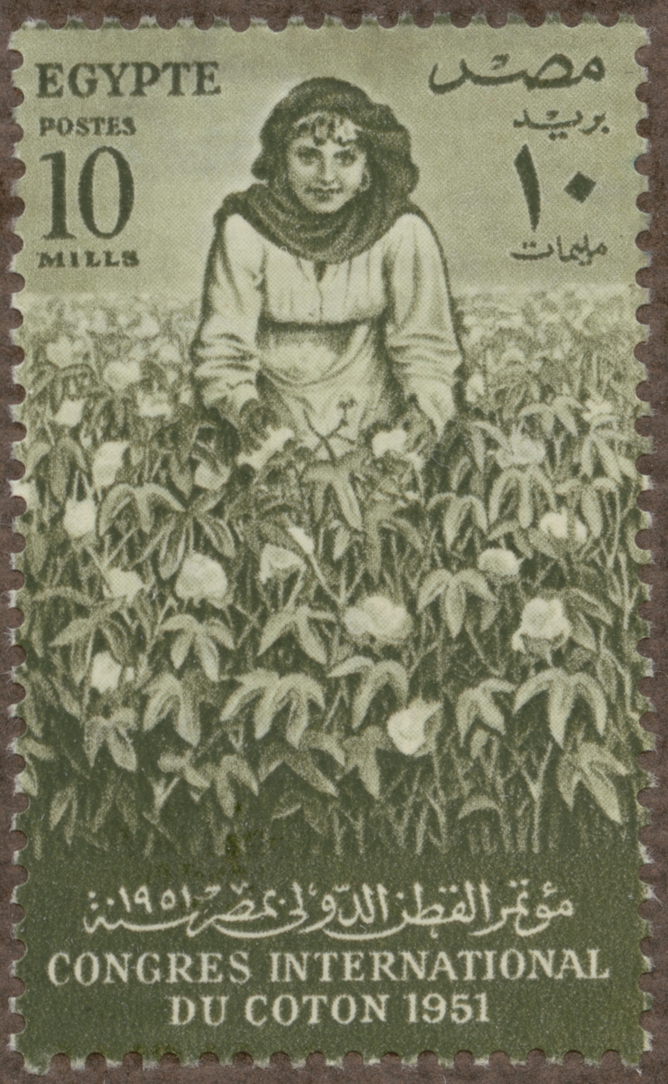 Frimärke från Egypten, 1951. Motiv av kvinna i bomullsplantage. "Propaganda för Internat. Bomullskongressen: 1951".