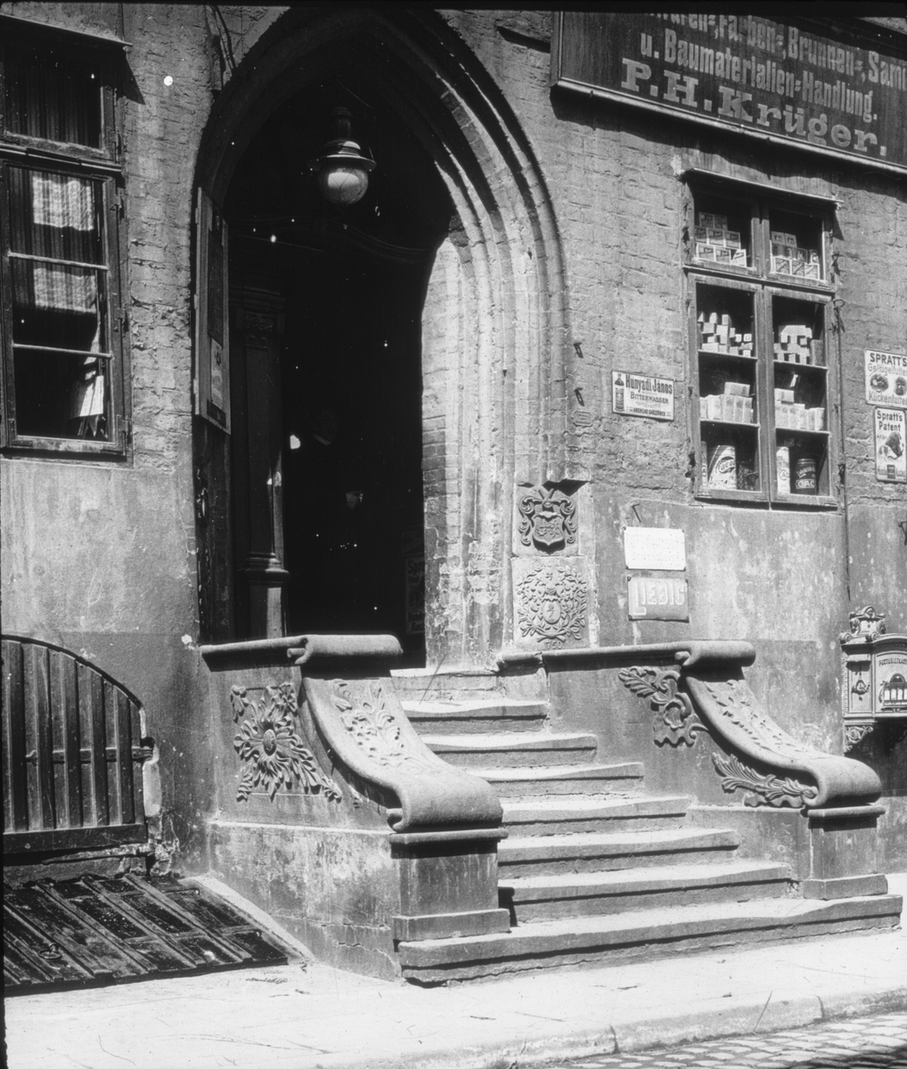 Skioptikonbild med motiv av port till byggnadsmaterialbutik i Lüneburg.