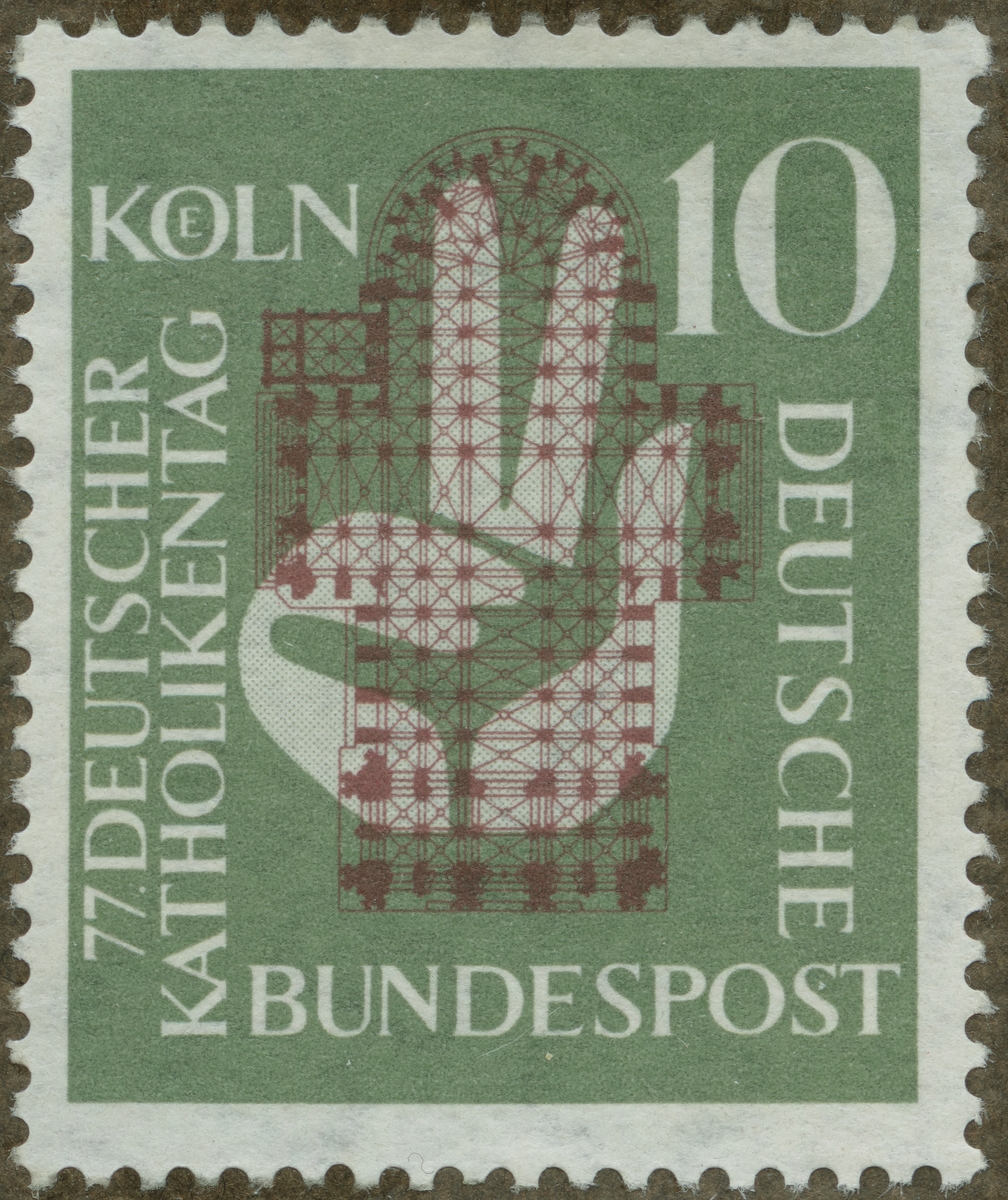 Frimärke från Västtyskland, 1956. Motiv av Kölnerdomens planritning. "77 tyska katolikdagen 29 augusti 1956".