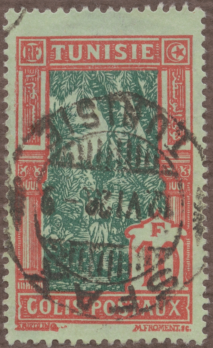Frimärke från Tunis, 1926. Motiv av skördande av dadlar.