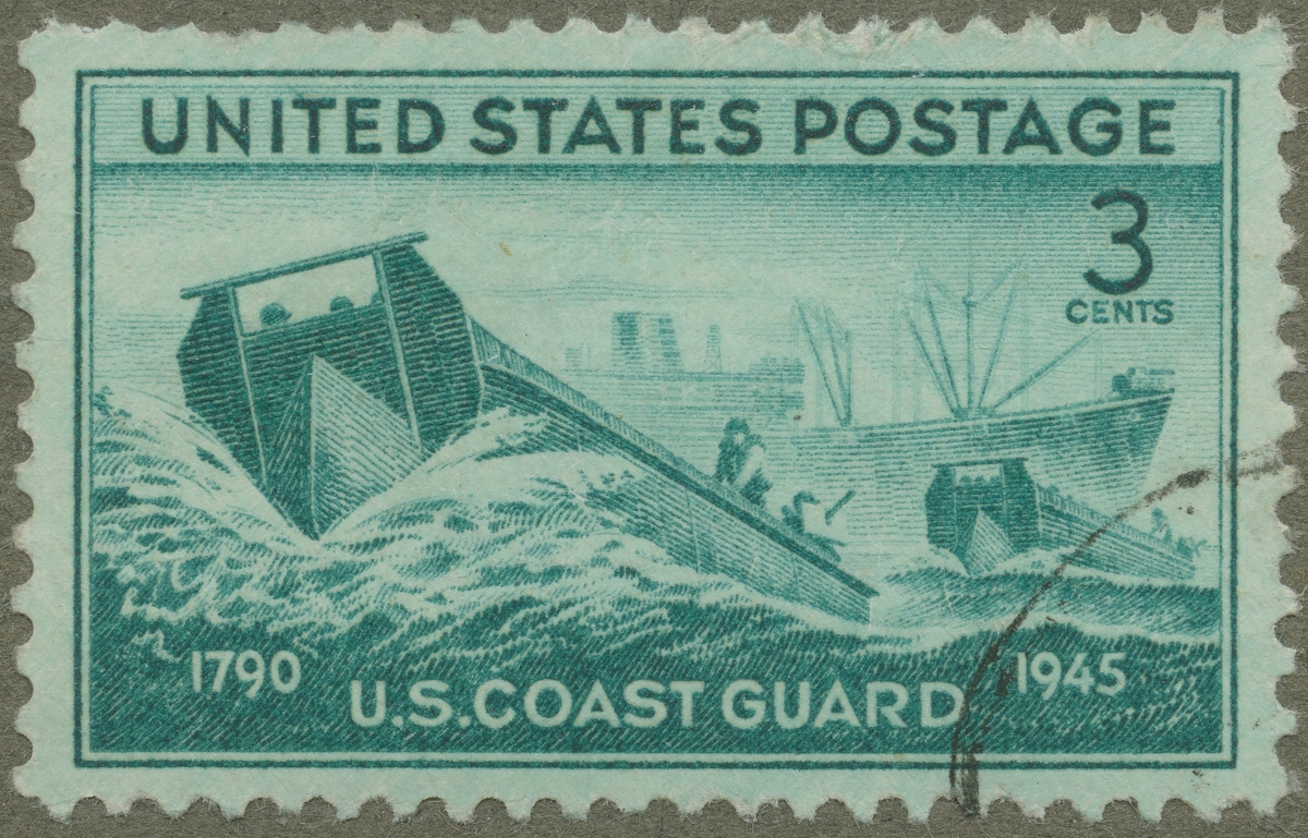Frimärke från U.S.A,, 1945. Motiv av Landstignings båtar (med förrådsfartyg i bakgrunden) "U.S. Coast Guard" (kustförsvaret) 155 år: 1790-1945. "Serie: Arméns och flottans insats under världskrig II."