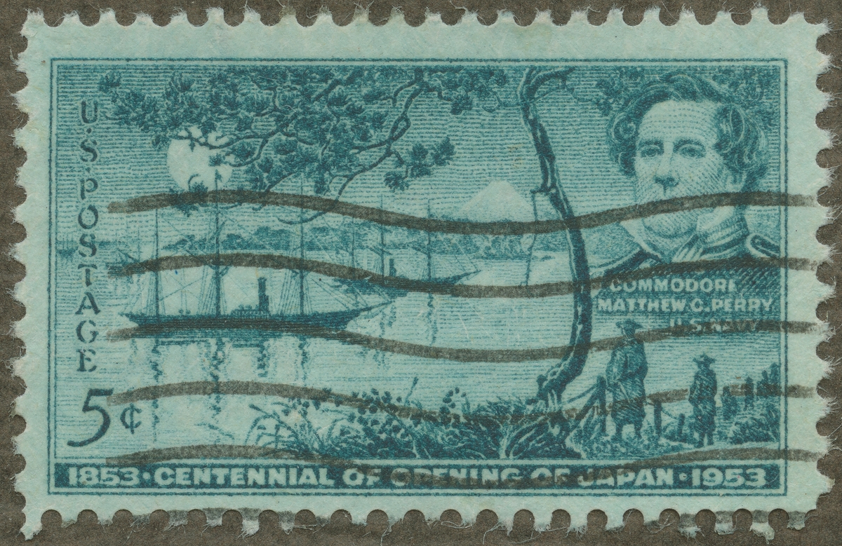 Frimärke från U.S.A,, 1953. Motiv av Kommendör Perry:s fartyg i Tokyobukten Fusijamaberget i bakgrunden (t.h.): Kommendör Matthew O. Perry, som förde förhandlingarna med Japan -100-årsminne av Japans "Öppnande" för världshandeln efter en isolation av mer än 200 år- 1853-1953