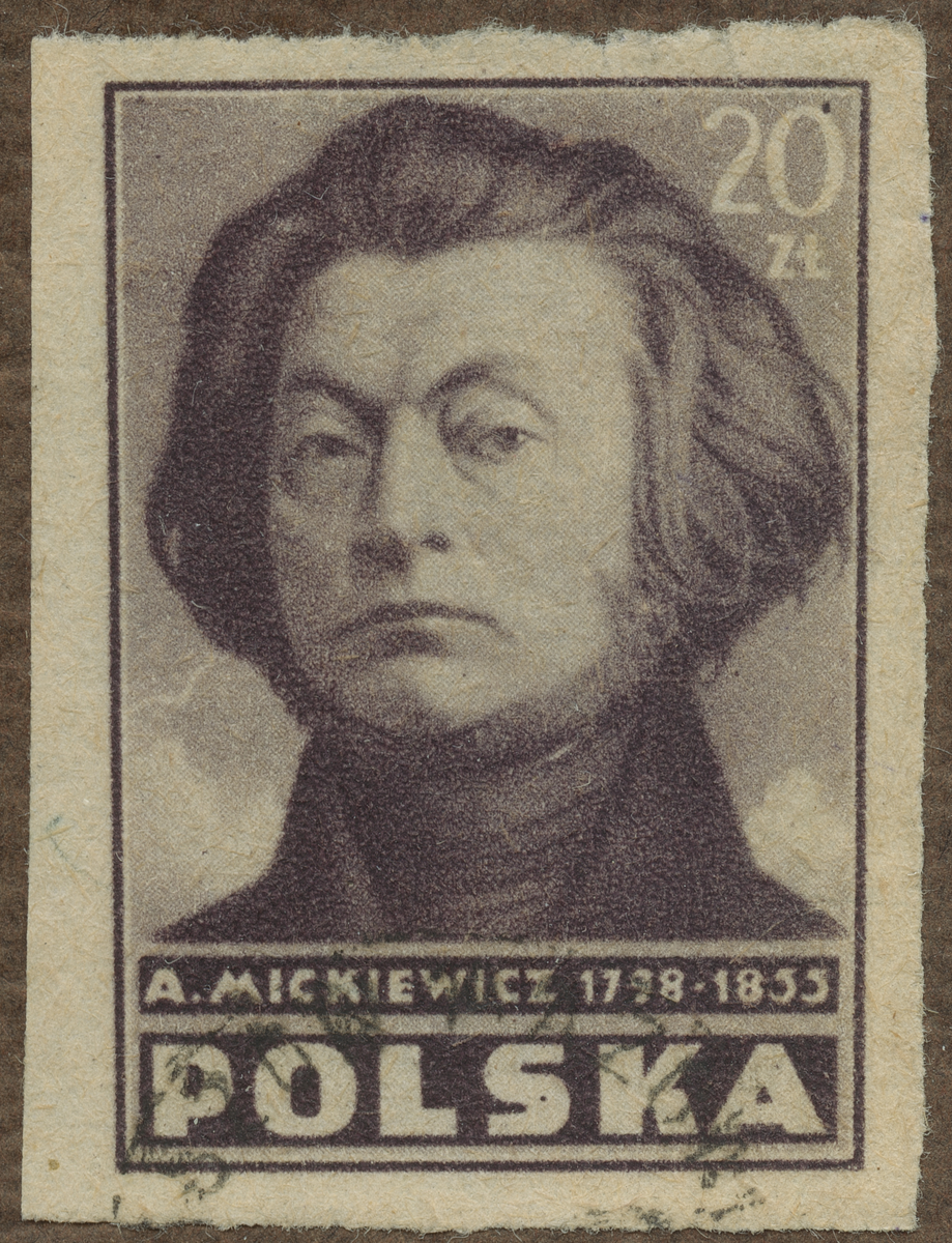 Frimärke från Polen, 1947. Motiv av A. Mickiewicz 1798-1855 Framstående polsk skald och fosterlandsvän Professor vid Collège de France 1840-1844 Begraven i Konungakryptan