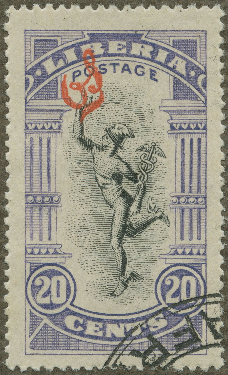 Frimärke från Liberia, 1918. Motiv av Merkurius Symbol för samfärdsel och handel
