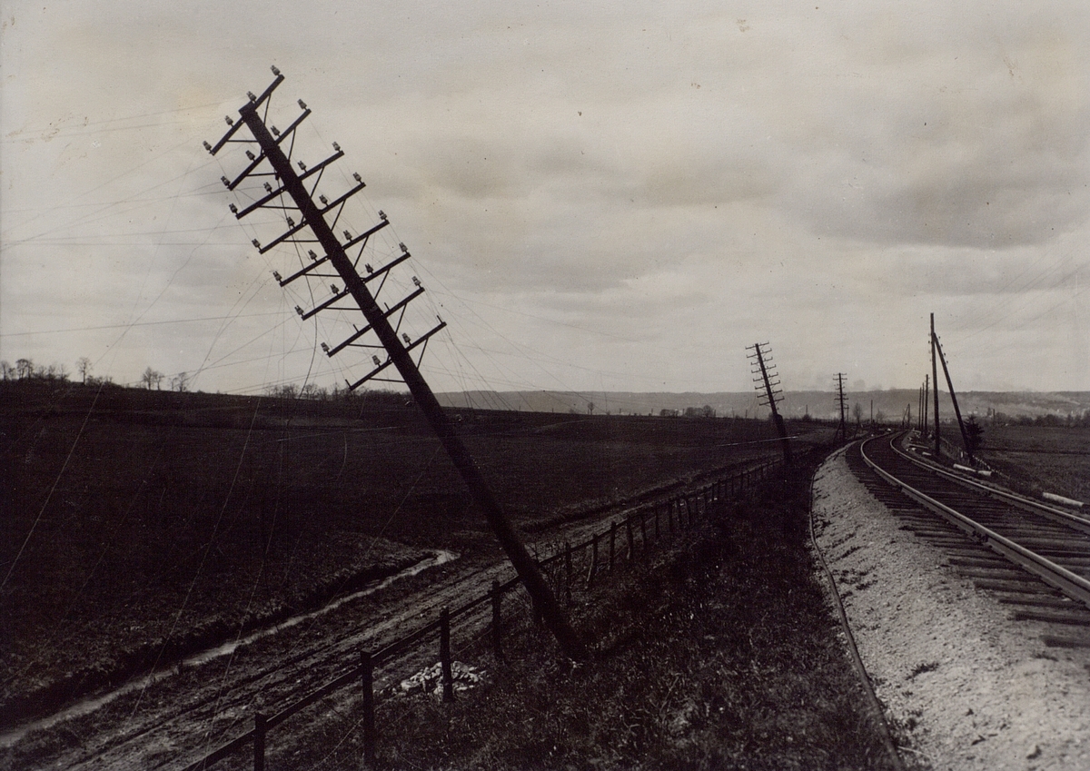 Under stormen 1915 vräktes ett 50 tal stolpar omkull utan att brytas. Bilden tagen från linjen Jönköping - Forserim den 15 maj 1915.