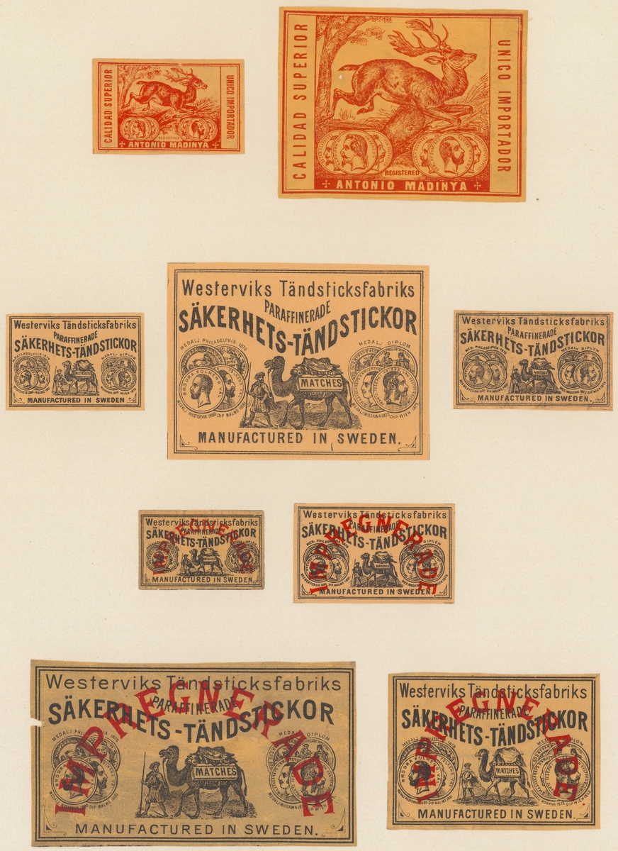 Etiketter för tändsticksaskar, från Svenskt Industri- och Handelsmuseum.