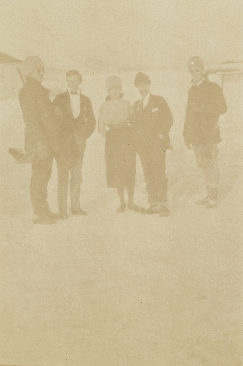 Fotografi från expedition till Spetsbergen. Motiv av fyra män och en kvinna som poserar i snön. En av männen har på sig kavaj, skjorta och fluga. En annan har kavaj, skjorta och slips. Två av männen har solglasögon och gevär.