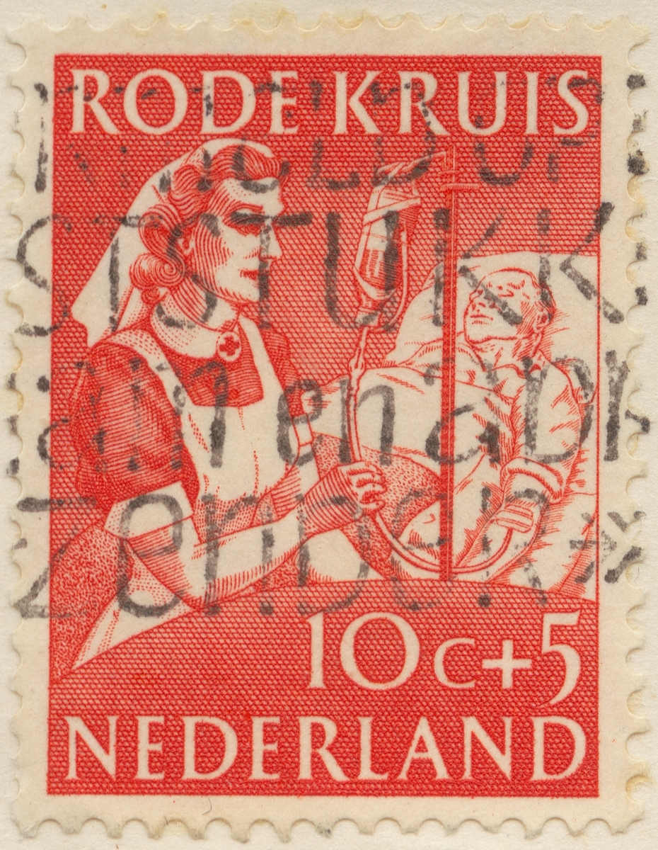 Frimärke från Nederländerna, 1953. Motiv av Sjuksköterska vid krigar-bädd givar blodtransfusion -Till förmån för Röda Korset-